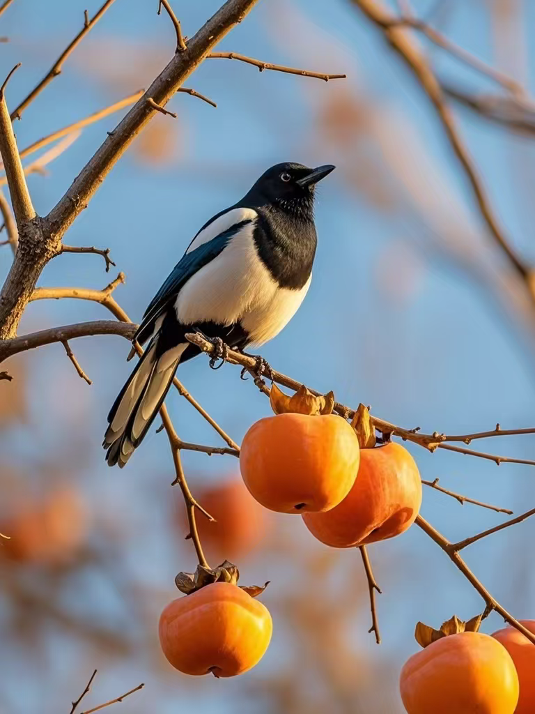 The sky is blue, persimmons are red, oranges are golden. Frost stands between dew and snow—sharper than dew, gentler than snow.