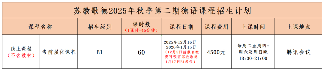 12月5日前成功报名缴费本期课程的学员,可优享苏教歌德2026年1月歌德B1等级考试考位。成功预留考位后,该课程不可退费!