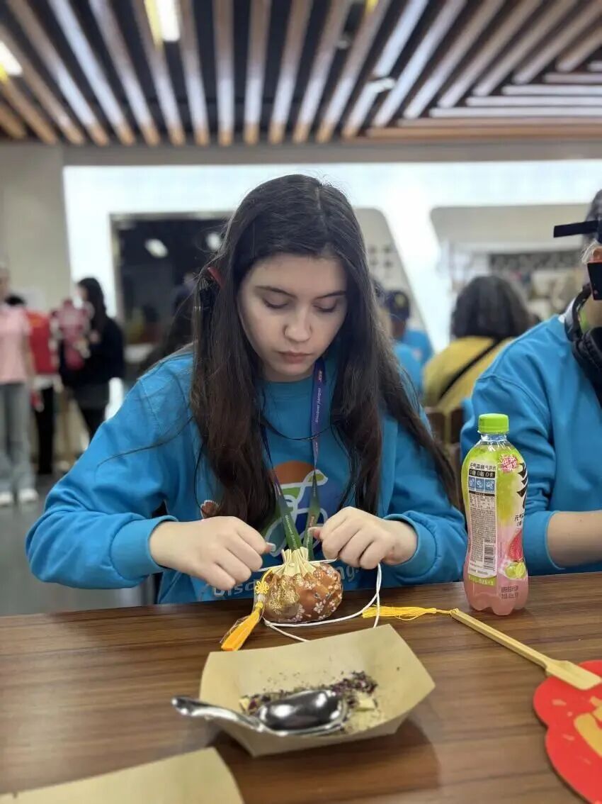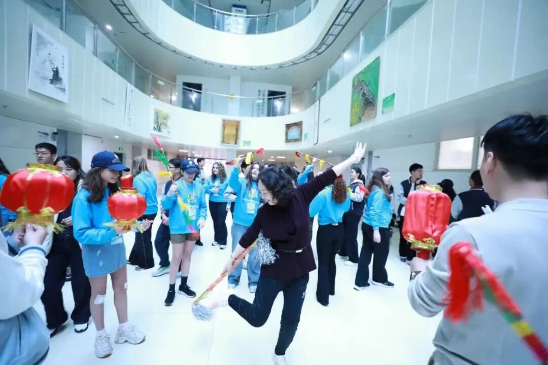 在泰州参访期间,英国师生探寻水乡文脉,品悟非遗韵味。在泰州职业技术学院,恰逢校园樱花节开幕,英国师生沉浸式体验糖画、彩绘、捏面、DIY香囊等非遗技艺,参与中华传统音乐、舞蹈互动展演,用指尖触摸匠心传承,以韵律感受艺术之美。在江苏省泰兴中学,中英学生共同体验扎染技艺,有序进行折叠、捆扎与浸染等步骤,通过实际操作感受传统工艺的巧思与东方美学的意境;一同跳起泰兴花鼓,让本土文化在交流中鲜活绽放;体验银杏嫁接实践,探索自然与技艺的共生;英国师生还走进泰州早茶学院,制作并品尝地道早茶美食,在市井烟火中感受泰州生活美学与人文温度。